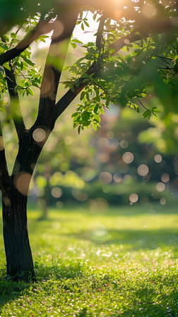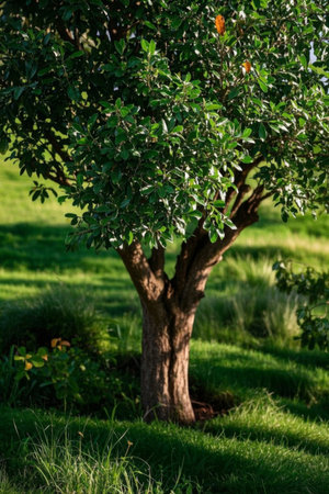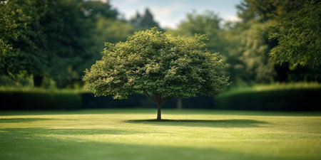 A beautiful green tree stands in a serene landscape, surrounded by lush grass and vibrant foliage. The sunlight enhances the tranquil scene, ideal for nature lovers.