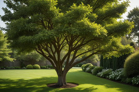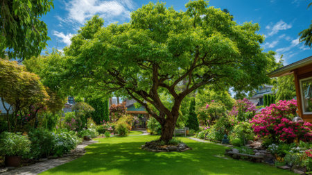 A vibrant garden showcases a magnificent green tree surrounded by colorful flowers and diverse plants, illuminated by bright afternoon sunlight under a beautiful blue sky.