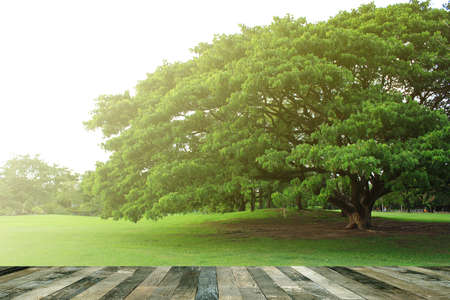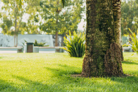 Park tree in the morning with footpath pathway with green plant and flower wood tree, beautiful city park garden nature environment