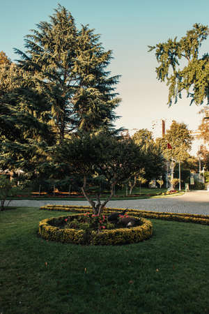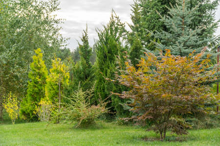 Beautiful spring garden design, with conifer trees, green grass and eneving sun