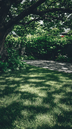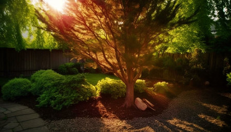 A serene backyard garden bathed in the warm golden light of sunset. Lush green foliage and a majestic tree create a peaceful atmosphere.