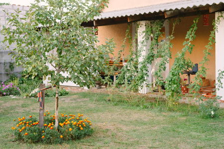 View of house in countryside with fruit trees and flowers. Country house in summer