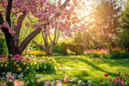 A beautiful garden with a tree in the middle and a lot of flowers. The flowers are pink and yellow