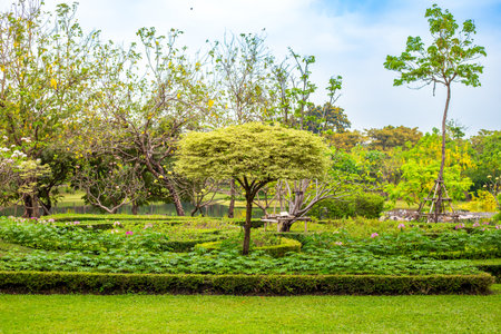 A neatly maintained garden with neatly trimmed hedges and a tree creates a peaceful landscape in the park.