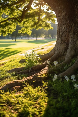 A vibrant park scene shows fresh green grass and tall trees peacefully surrounding a tranquil setting filled with soft morning light. Nature invites relaxation and enjoyment.