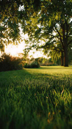 Low angle view of a meticulously maintained green lawn basking in the glow of the setting sun, with blurred trees creating a peaceful, idyllic park scene.