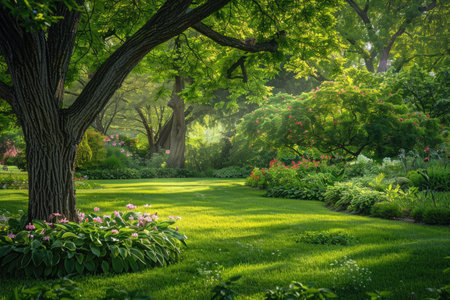 A tranquil garden scene captures the beauty of nature with morning light filtering through majestic trees, highlighting lush greenery and a peaceful atmosphere.