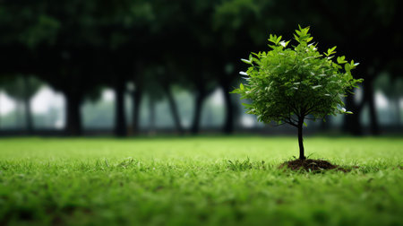 A solitary green tree stands proudly in a lush grassy landscape, casting a gentle shadow as bright sunlight illuminates the scene, evoking tranquility.