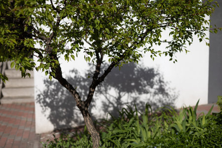 tree branches and green leaves in garden with shadow on a white concrete wall.