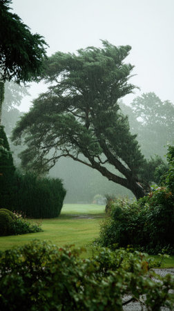 Atlas cedar in a storm, heavy rain pouring down, strong winds twisting their leaves, natural.