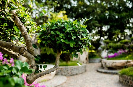 A close-up captures a bonsai tree set within a small brick structure surrounded by trimmed hedges. Its branches reach outwards, displaying vibrant green leaves. The scene shows a balance of light and shadow, indicating an outdoor daytime context. Suitable for commercial projects.
