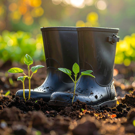 Black rubber boots in soil with green plants and a soft blurred background. Clear details and vibrant colors ...
