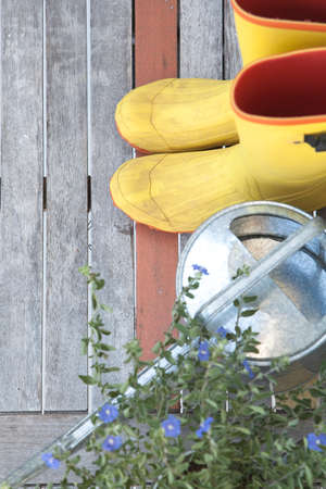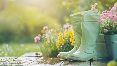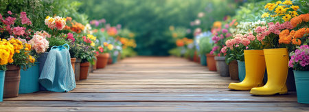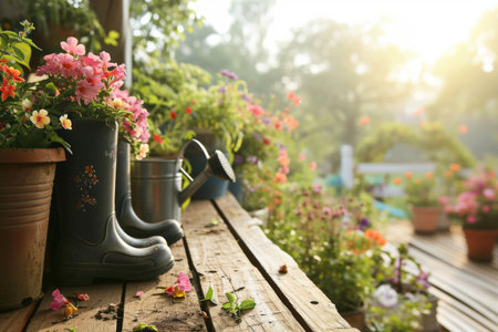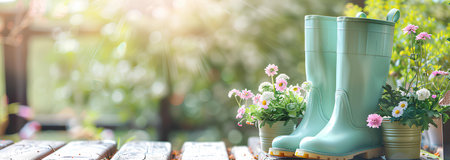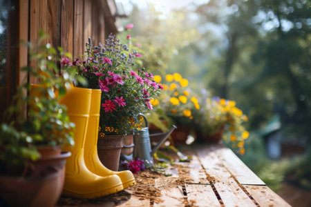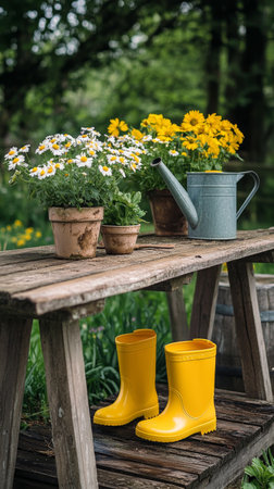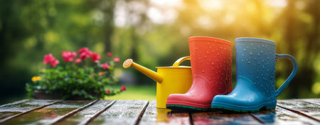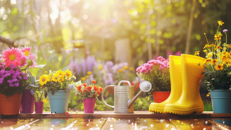 Bright garden scene with bright yellow rubber boots, colorful potted flowers and a watering can set on a wooden table bathed in warm sunlight