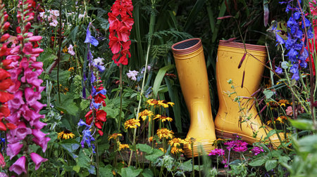 A pair of bright yellow rubber boots sits beside beautiful flowers in a sunlit garden, symbolizing joy and inspiration for gardening enthusiasts and outdoor lovers.