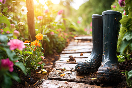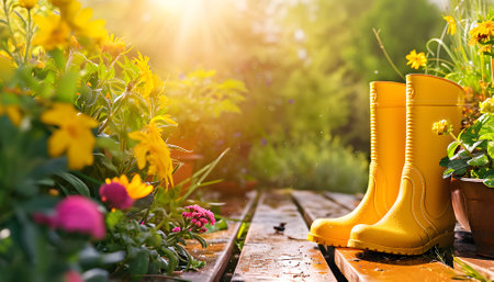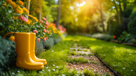 A cheerful pair of yellow rubber boots sits on a wooden garden path, surrounded by lush greenery and vibrant flowers, capturing the essence of spring gardening delight.