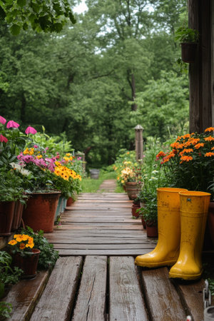 A pair of bright yellow boots sits on a wooden walkway, framed by colorful pots of blooming flowers. The lush garden exudes a serene atmosphere during the daytime.