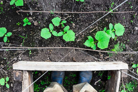 Gardener in rubber boots planting vegetables in the garden. Selective focus.