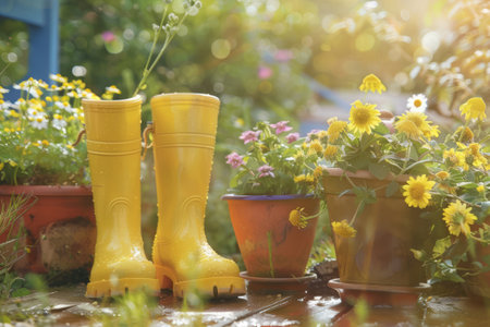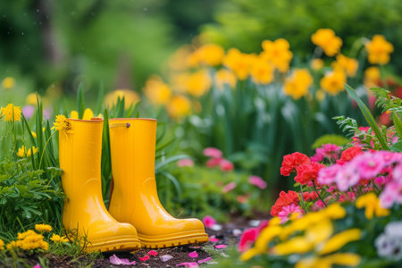 Yellow rain boots in a garden, surrounded by blooming flowers, soft sunlight, vibrant and cheerful