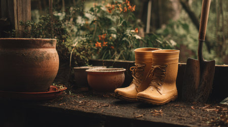 Charming scene of yellow rubber boots resting on a rustic garden shelf with flower pots and a shovel, evoking a peaceful atmosphere of outdoor gardening.