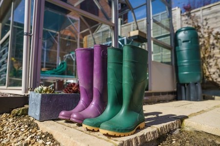 Close up of a pair of purple and green Wellington Boots stood outside a green house in a garden