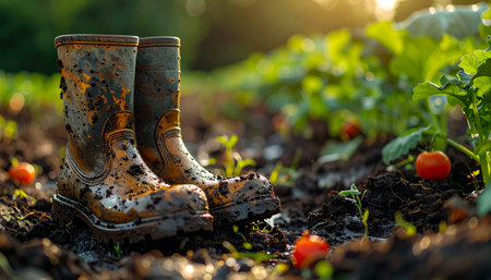 A pair of well-worn gardening boots sits on a dark, rich soil path, surrounded by lush green plants. The scene invites a sense of tranquility and nature.