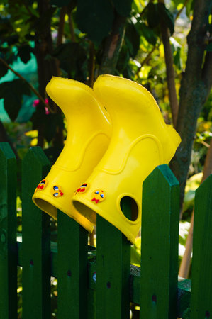 Kids yellow rubber rain boots on green fence. Games and playing having fun, jumping in puddles in rainy weather in spring, summer and autumn