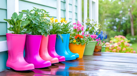 Colorful flowers sprout from vibrant boots, welcoming spring on a lovely porch.