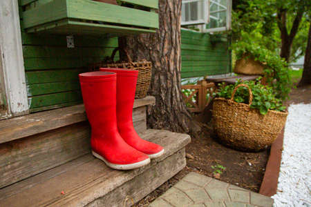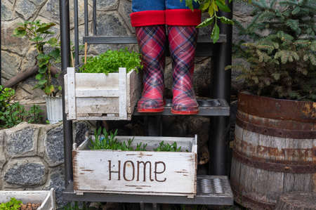 Two pairs of rubber boots with a bouquet of green mint on the stone steps on the street against the backdrop of green trees. soft focus.