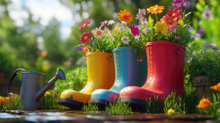 Fresh flowers sprouting from colorful rubber boots, with a watering can nearby, creating a whimsical garden scene.