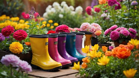 A pair of red rubber boots among colorful garden flowers, on a wooden deck against a vibrant background. High quality illustration