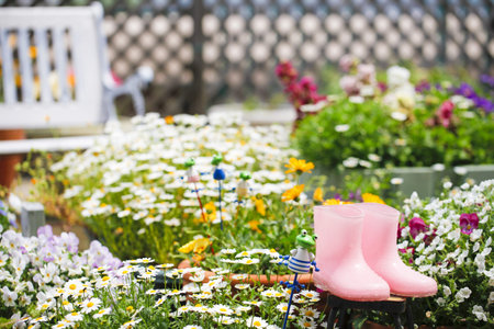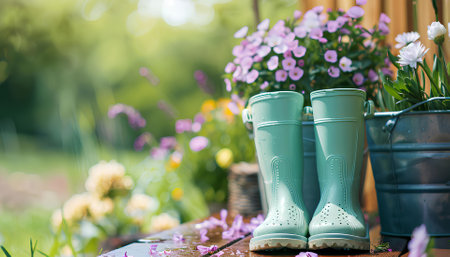 Green rubber boots in a vibrant flower garden with colorful blooms and rich soil, gardening concept