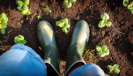 Fresh green plants thrive in soil as a gardener stands in stylish boots, enjoying springtime.
