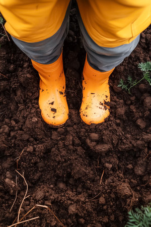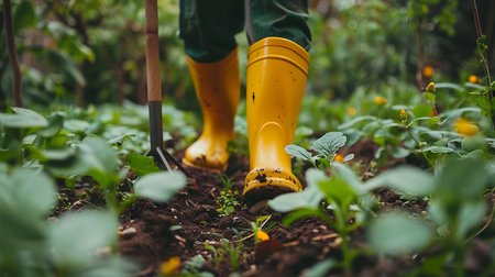 Bright yellow boots standing on rich dark soil. Outdoor gardening activity in a lush setting surrounded by plants. Concept of agriculture, gardening, earth awareness, sustainability.