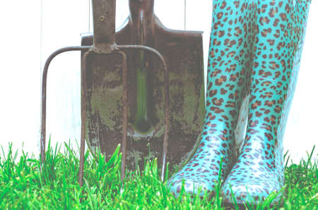 Gardening tools with rubber boot garden equipment at back yard on soil background
