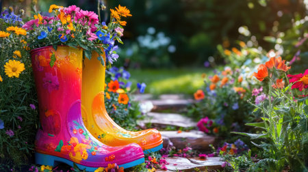 Vibrant spring rain boots overflowing with wildflowers, creating a stunning and colorful display in a sunlit outdoor garden setting.