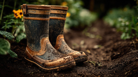 A pair of rustic gardening boots sits in a muddy patch of soil, surrounded by blooming flowers, showcasing the beauty of outdoor gardening. Perfect for nature lovers.