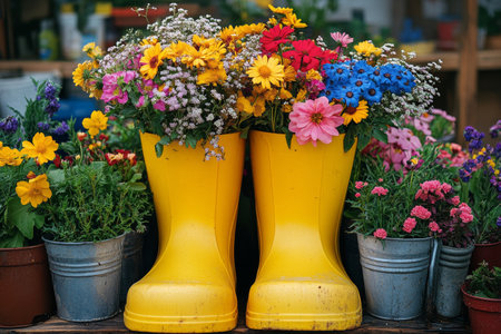 Bright yellow rubber boots stand on display, overflowing with a variety of flowers in multiple colors. Surrounding them are pots of blooming plants, creating a cheerful garden atmosphere.