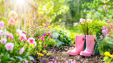 A pair of bright pink rubber boots sits amidst a colorful flower garden, bathed in soft sunlight. The scene evokes feelings of tranquility and joy in nature.