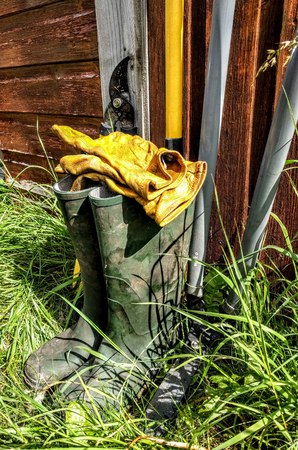 A pair of wellingtons sat outside a shed on the grass with a pair of gloves and gardening equipment behind them.