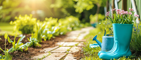 A picturesque garden path lit by sunshine with a blue watering can and rubber boots on a green grass in the foreground in the garden