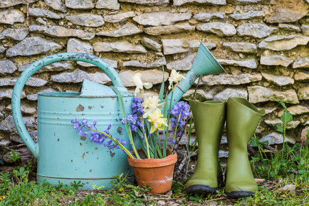 gardening tools in the garden. Watering can, rubber boots and flowers