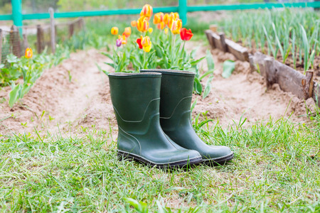 Yellow rubber boots and yellow tulips on the ground in the garden