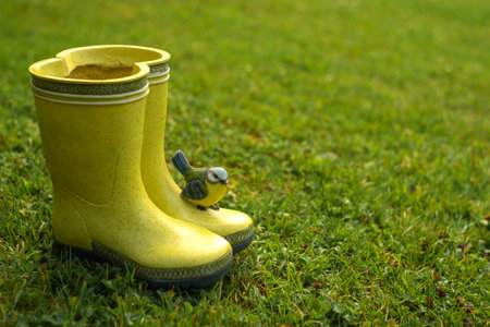 Yellow rubber boots with a tit sitting on them. A street statuette on the green grass . Decoration for the garden.
