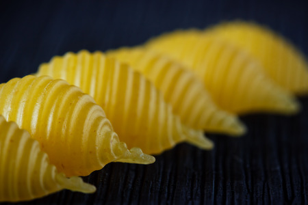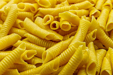 Classic pasta from hard wheat varieties isolated on yellow background, close-up