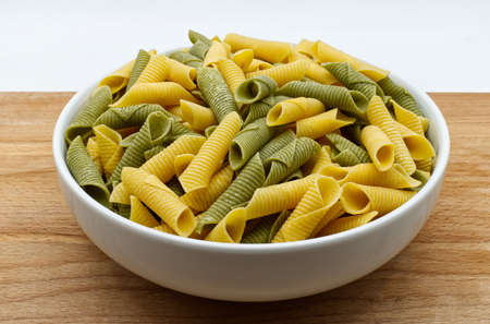 Raw Organic Dry Pennoni Pasta in a Bowl, top view. Copy space.