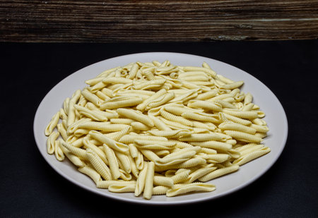 Lot of whole uncooked pasta cavatelli in ceramic stewpan with brown textil cloth isolated on black glass