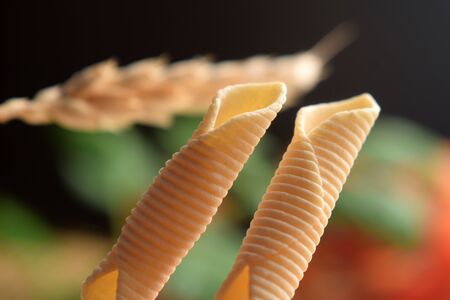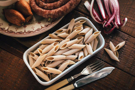Food background - dry penne pasta, whole wheat uncooked ingredient