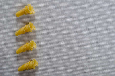 Dry Gigli or campanelle pasta on a white textured background. Lined up pasta. Copy space. Cooking or advertising background.