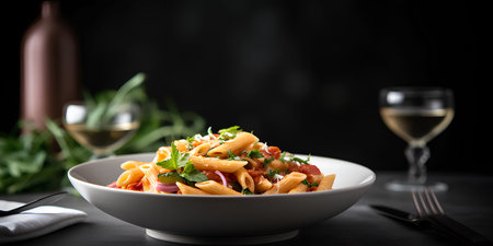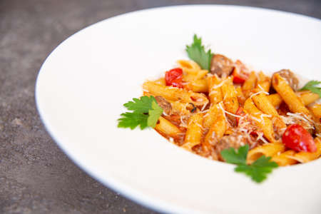 Pasta arrabbiata with tomato sauce on a plate. Italian food.