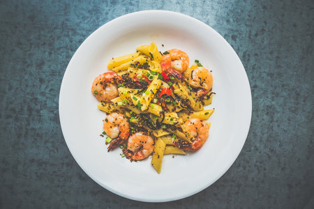 nourishing and healthy pasta, macaroni with colorful and tasty vegetables and capers